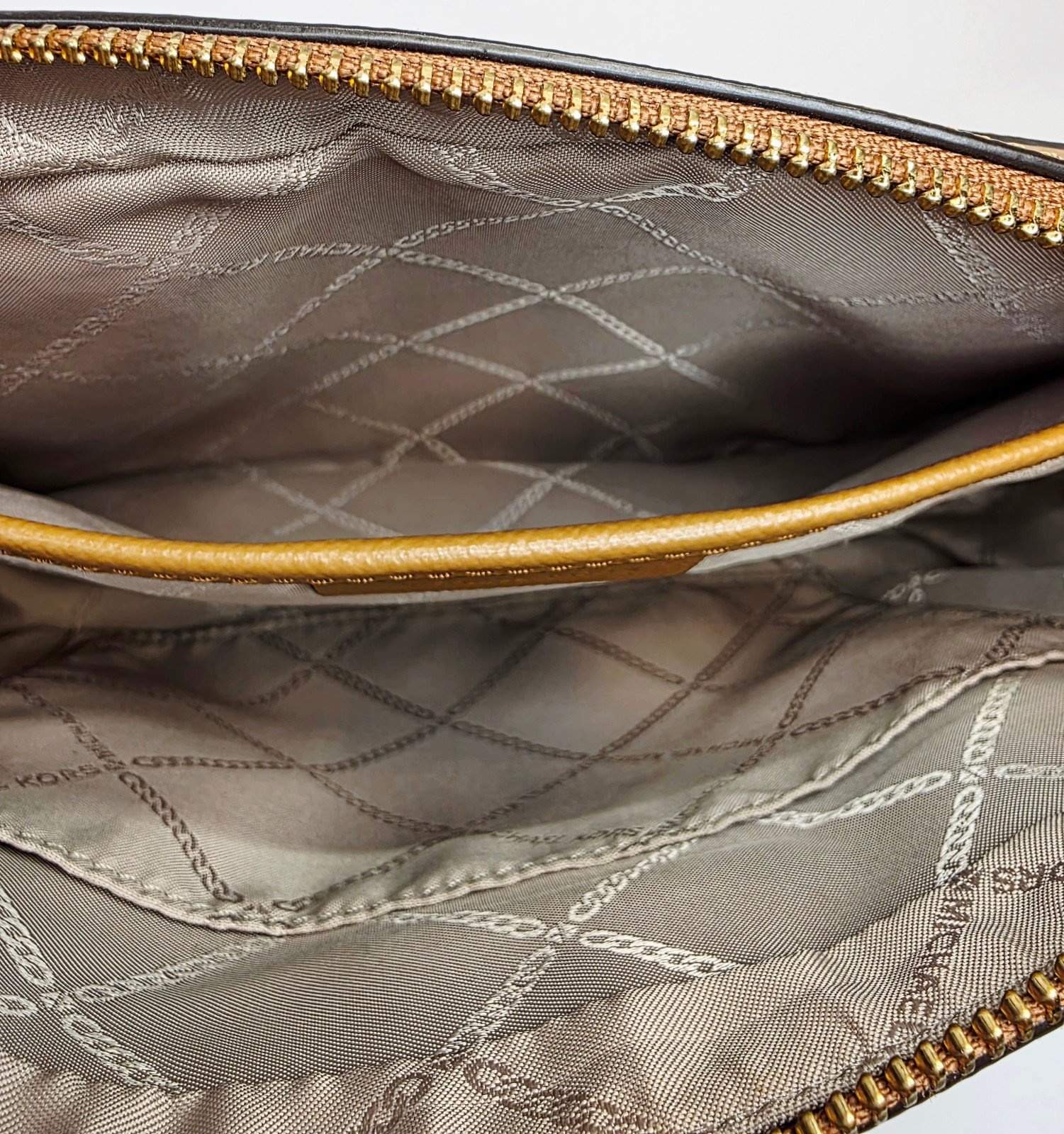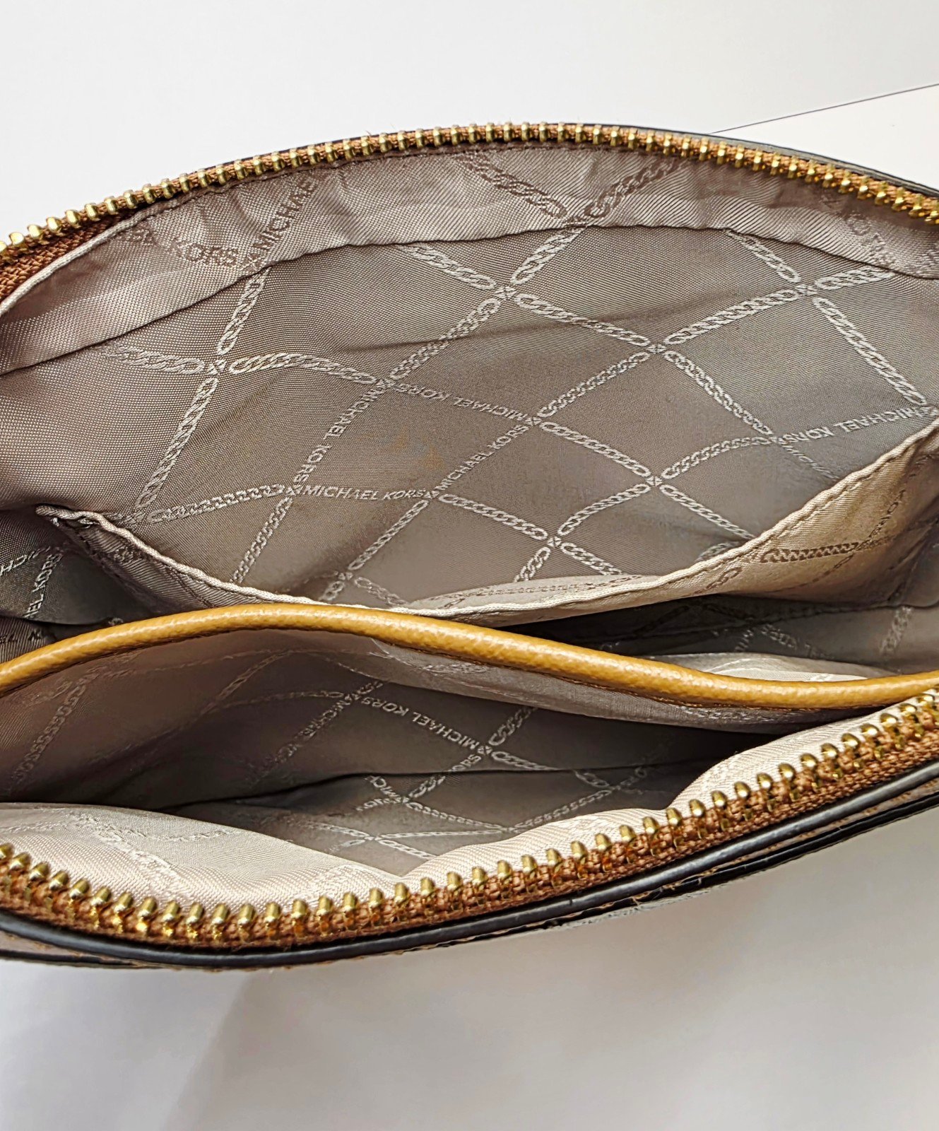 MK Printed canvas exterior with gold-tone hardware and Michael Kors pinmount logo on the front of the bag