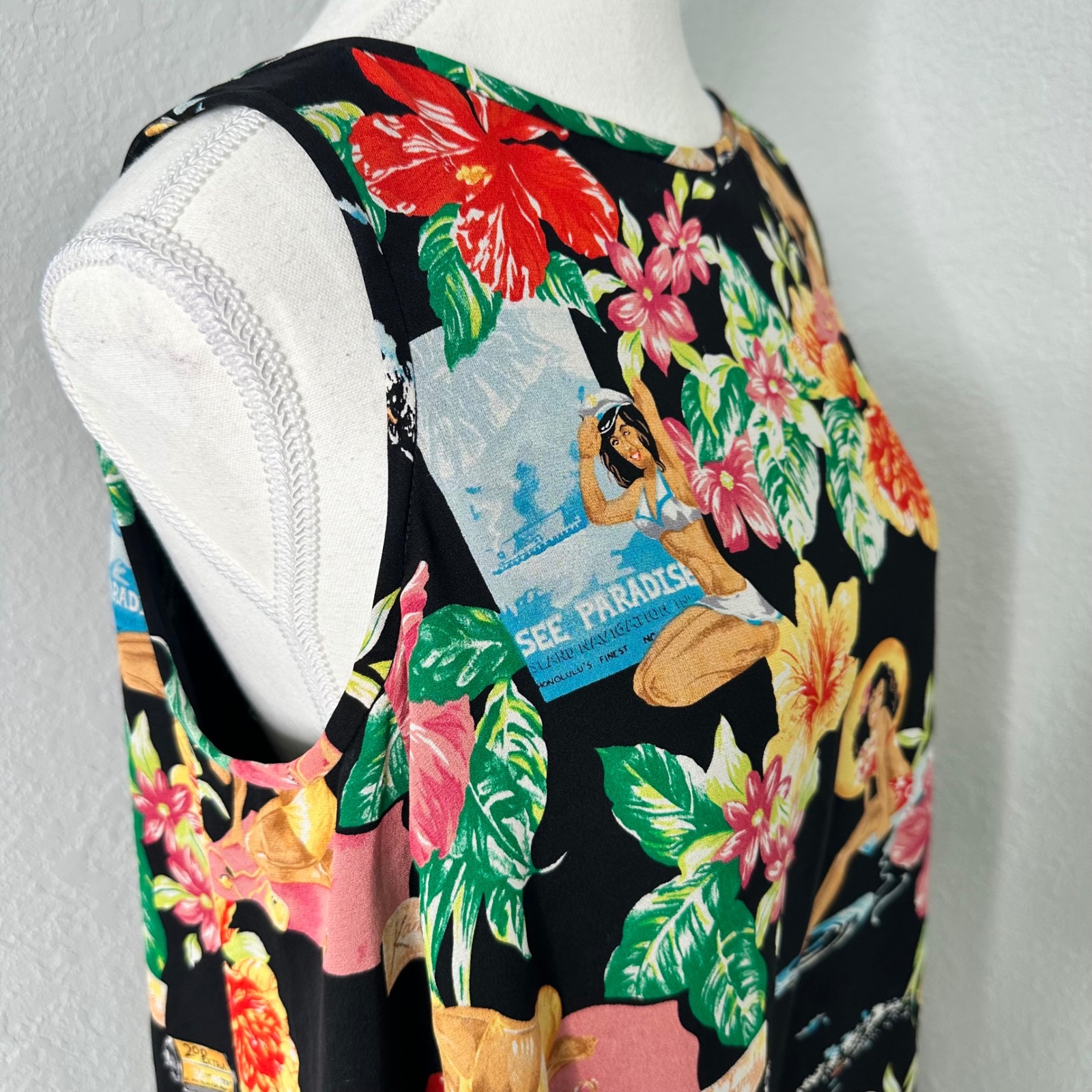 Vintage 90s Nicole Miller, silk novelty print dress, pinup girl dress, tropical resort dress, hibiscus floral silk, rare Nicole Miller silk, Hawaiian vacation dress, collectible Nicole Miller, Y2K retro style, cocktail shift dress
